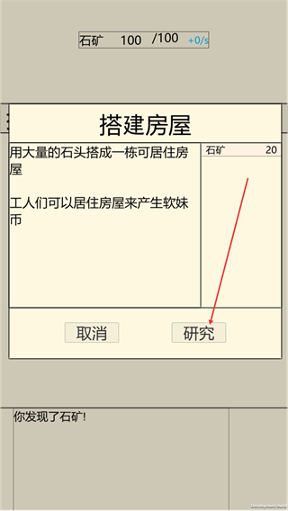 3、在搭建房屋弹窗中点击研究,消耗20石矿,解锁房屋以生产软妹币。
