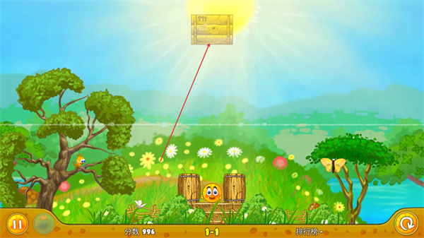 4、云朵释放的物体下落,需确保木箱遮挡橙子,避免其受到伤害,推进关卡。