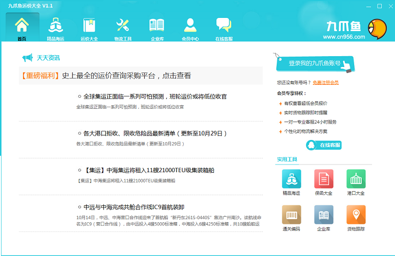 九爪鱼运价大全是一个汇聚所有在线可视化运价的运价平台。九爪鱼运价大全主要用于在线运价查询,在线订舱以及在线电子对账,包含了各大港口的优质运价信息。下载九爪鱼运价大全,让你轻松了解货代圈。