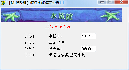 疯狂水族馆豪华版1.1修改器是专为《疯狂水族馆豪华版》打造的修改工具,对应的游戏版本为v1.1,支持修改金钱、时间、贝壳数,还可以让出场宠物数量无限制,更多的宠物帮你战斗。赶快下载体验吧!