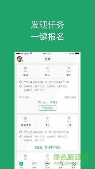 那啥译员版是一款非常好用的口译翻译软件,用户可以在线接单帮助翻译,订单进度随时更新,还可以直接和客户进行沟通,各国语言都可以,使用简单超级好用,而且还可以根据自己的语种特色,进行匹配,需要的用户快到绿色资源网下载体验吧!