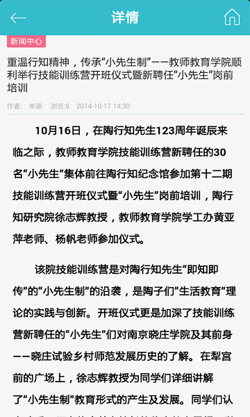 i晓庄是学校为全体师生和校友及公众打造的移动校园应用平台。通过i晓庄可以了解学校新闻、通知公告等校园动态信息,还可以查看招生就业、校园黄页、班车信息、个人信息等学习生活服务信息。
