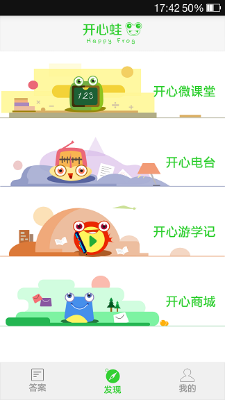 开心蛙是一款由北京乾坤翰林文化传播有限公司开发,配套《开心蛙状元作业》人教市场小学1-6年级(人教版唯一授权)电子版答案的手机应用。此应用基于Andorid平与ios平台,集成扫描书中二维码获取对应答案、创意视频、开心电台、社交、创意游戏等功能。