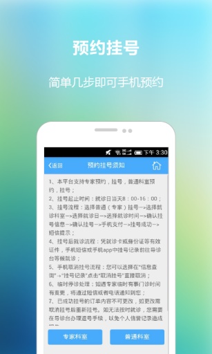 5.【预约】提供本院所有科室门诊预约,患者只需一部手机,即可完成预约挂号的操作,并可以在软件上查看医院特色科室和医院名医专家。