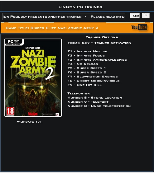 纳粹僵尸部队2修改器是游戏《狙击精英:纳粹僵尸部队2》的一款多功能辅助工具。软提供无限集中、无需装弹、超级速度、一击必杀等十项功能,软件使用简单,运行游戏打开修改器,按相应的功能键即可!赶快下载体验吧!