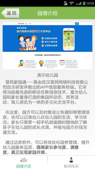 慧民家园通是由武汉慧民网络科技有限公司自主研发并推出的APP信息服务终端。软件采用当前最先进的移动互联信息技术,是为幼儿园和家长量身打造的集园所动态、班务活动、育儿资讯为一体的多元化交流平台。