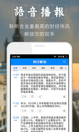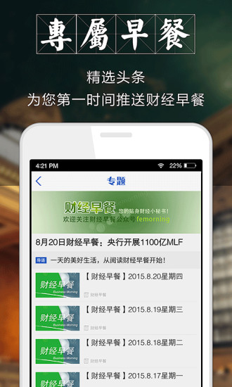 财经早餐语音版是一款智能的财经头条推荐app,每天早上为你推荐财经界最及时的消息,让你时时刻刻与世界接轨,专业的小编为你优化编辑,轻松享受财经早餐,喜欢就下载吧!