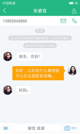 3、房东与租客在线交流,支持图片传送和语音聊天功能