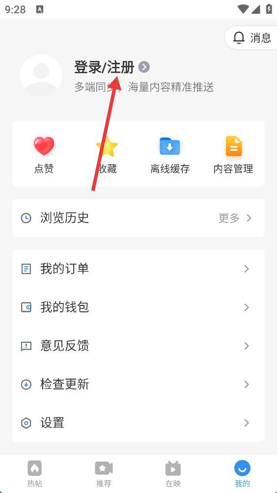 1、打开影视大全,点击我的,进入个人中心页面,点击登录/注册选项。