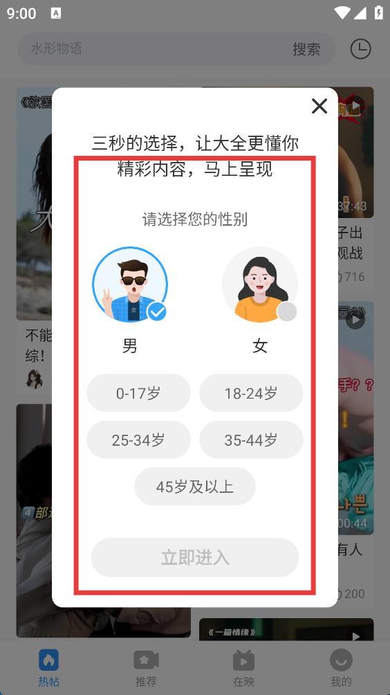 4、若弹出性别和年龄选择界面,选择好信息,即可点击立即进入。