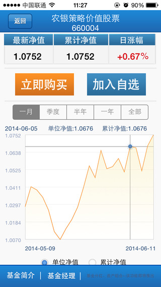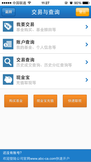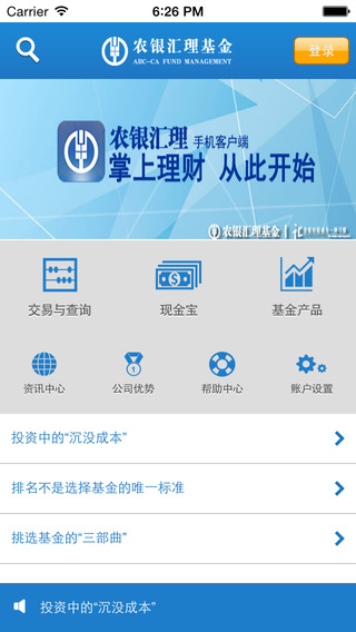 农银汇理基金是农银汇理基金管理有限公司推出的移动客户端基金理财工具,它不仅提供基金交易、账户查询、最新理财资讯等功能,同时还实现了货币T+0、帐单定制等实用功能。无论您是在家里,上班途中,或是出门在外,通过农银汇理基金,您都可以实现“随时查阅、随身交易”!