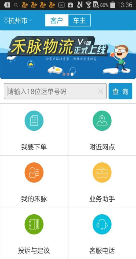 1.禾脉物流APP有货主与车主两个界面,具有网点查询、下单接单、订单查询、跟踪、运输救援等基本功能,更多贴心服务,尽请期待!