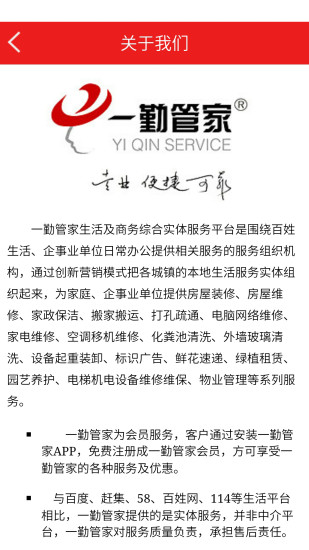 宜昌一勤管家安装工程有限公司(简称“一勤管家”),是一家关注于房屋居住使用过程中,对房屋及其附属的设施、设备、园林及绿化进行维护、保养和改造,对百姓居家生活或企事业单位办公场所提供诸如清洗、宜昌保洁保姆、宜昌搬家等劳务服务的一家综合性、专业化服务公司。公司的主要业务包括:宜昌装修,新房、毛坯房装修,二手房、旧房改造、房屋日常维修,旧房拆迁拆除,房屋机电设备(含电梯)安装与维护,装修装饰施工监理,园林及绿化养护,物业管理,房屋保洁、宜昌家政、宜昌搬家搬运,洗车服务等。是国内第一家专注于用户在房屋居住过程中所需的各种便利性服务的专业服务公司。