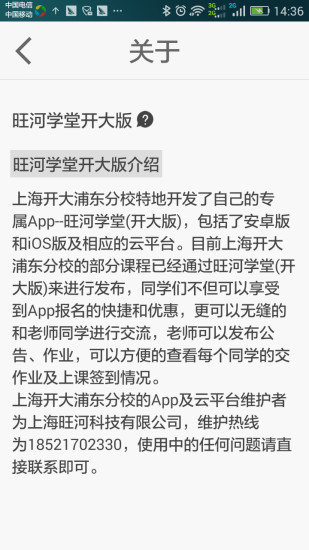 上海开大浦东分校的App及云平台维护者为上海旺河科技有限公司,维护热线为18521702330,使用中的任何问题请直接联系即可。