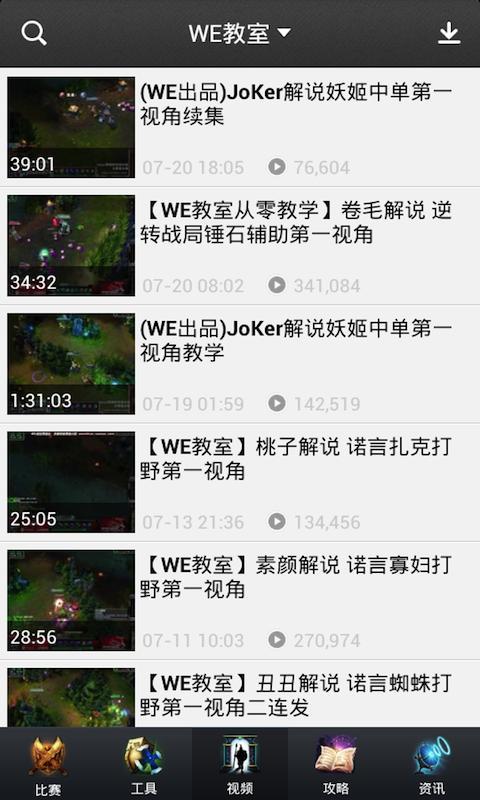综合七大类视频(WE教室、LPL职业联赛、精彩击杀、JY、小智、新版本介绍、吨叔娱乐视频),提供便捷的下载功能。强大的视频搜索!