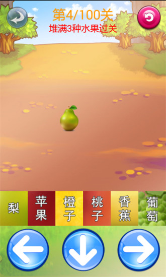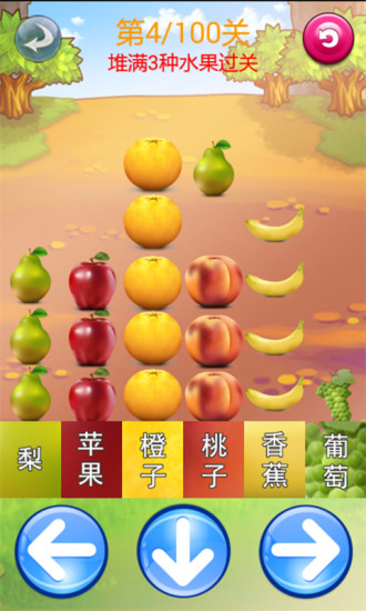 时尚又好玩的俄罗斯水果终于来啦!该游戏总共有100关,每一关都有不同的过关条件,根据过关条件你必须堆满相应的水果,本游戏适合儿童玩,边玩游戏边识水果。所以快来下载吧!ps:5个水果即为堆满。
