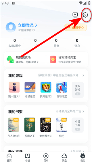 1、打开UC浏览器,进入个人中心页面后,点击齿轮形状的设置按钮。