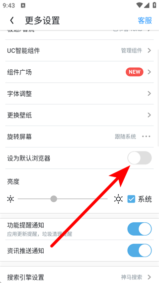 3、进入更多设置后,找到设为默认浏览器开关,打开即可完成设置。