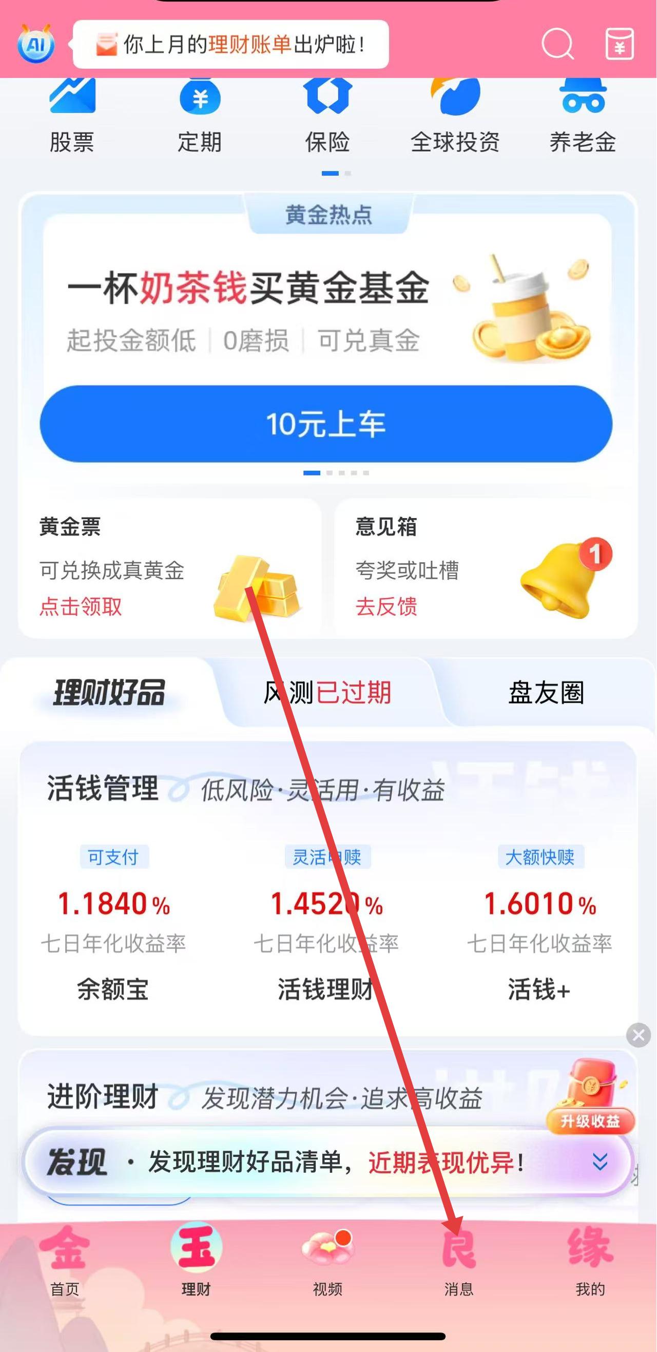 1、打开支付宝应用,点击底部导航栏中的消息进入消息页面。
