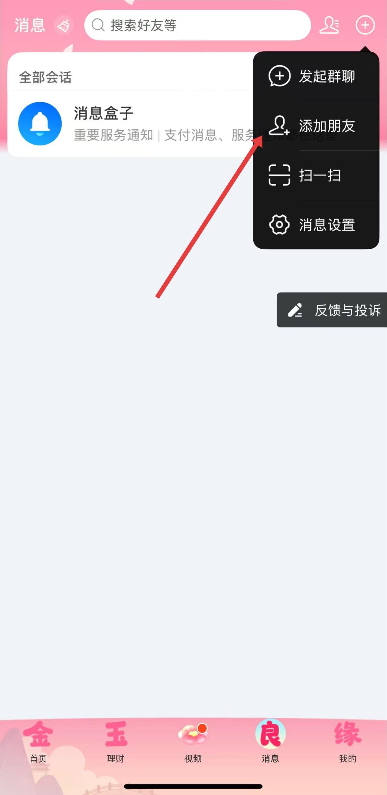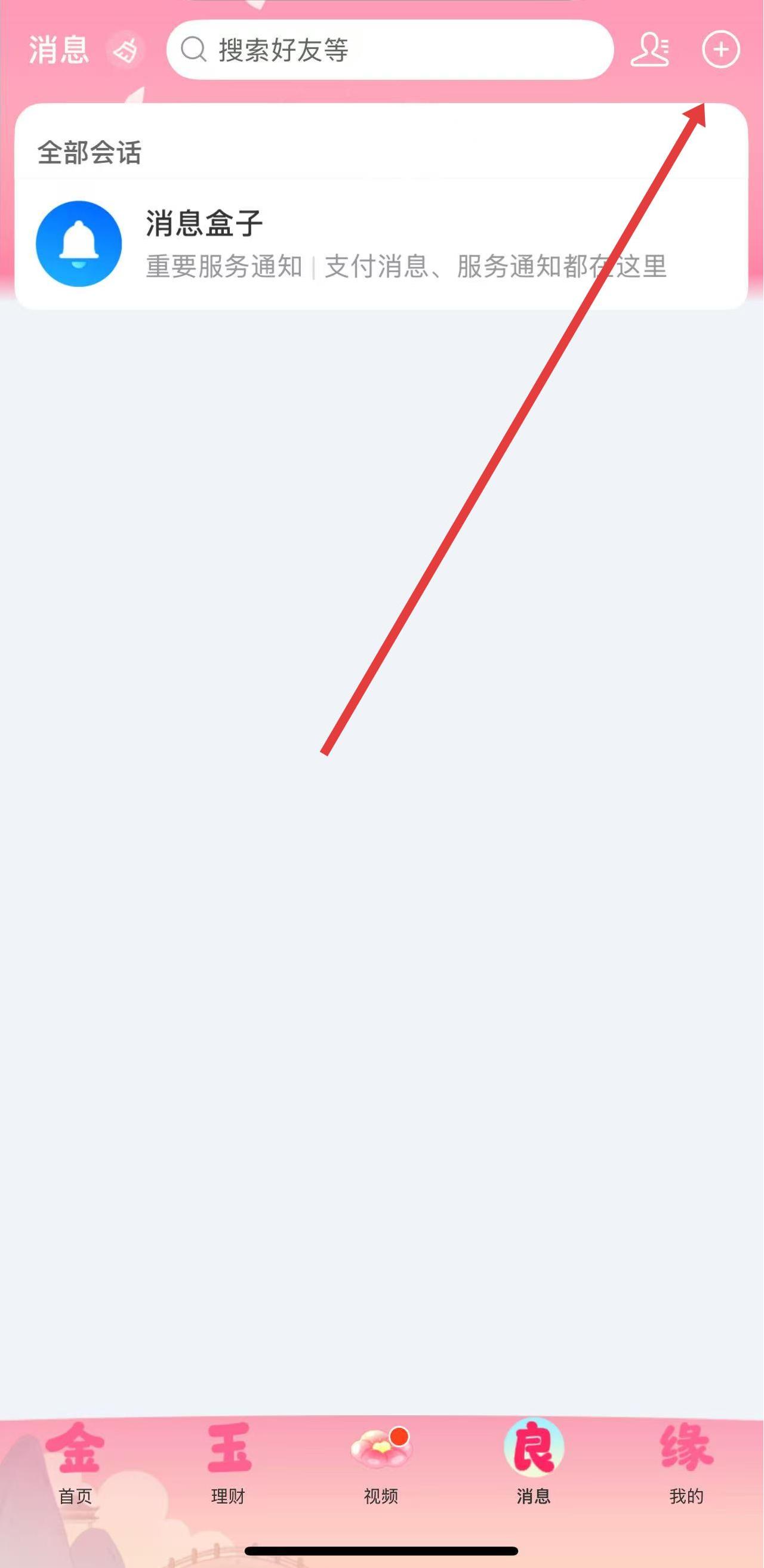 2、在消息页面的右上角,点击加号号图标调出操作菜单。