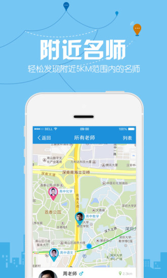 2.LBS定位:精确定位附近5KM范围内名师,自动推荐离您最近的老师