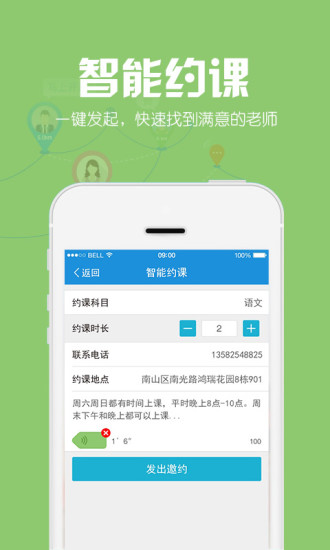 1.智能约课:学生发起约课,发送至附近5KM范围内符合条件的老师,老师抢单,学生选择老师,创新约课领域“抢单+自主选择”模式