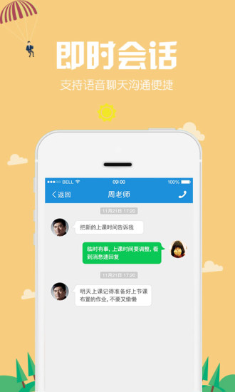 3.聊天功能:内置IM聊天工具,可与老师实时沟通,文字、语音畅聊
