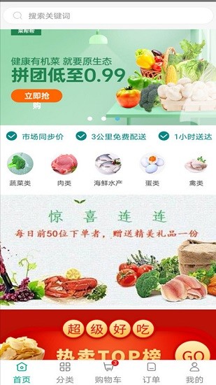 菜帮帮生鲜是非常好用的生鲜购买平台,在这里用户们能够找到超多种类的生鲜商品进行购买,蔬菜、水果、肉类、海鲜水产、蛋类、禽类、粮油、酒水等等等等全都能够在这里找到,全面的商品能够让用户们更好的进行使用,还有非常便捷的送货功能让用户们能够快速拿到自己商品。