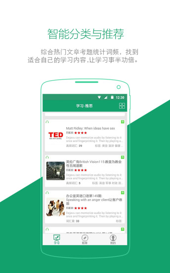 英语教科书,模拟试卷,是不是很枯燥?来听听BBC、CNN的最新新闻,智能引擎根据用户的学习目标和学习进度自动生成和推荐合适的实时内容给用户,让你快乐学习