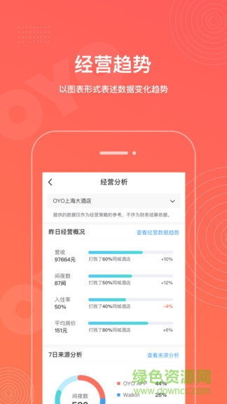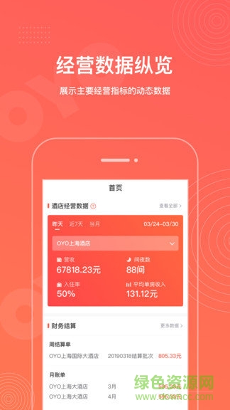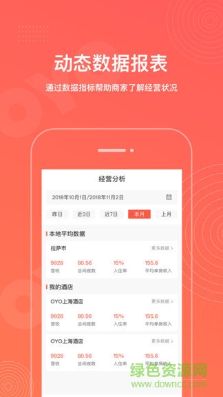 oyo家盟app是专为开酒店的朋友们提供的一款手机在线办公软件,这款app正是结合了这些要素,帮助经营者在激烈的市场中抢占先机,持续优化运营模式,最终实现可持续发展目标,方便商家以最低的成本获得最大的流量与收益,值得每一利用该软件可以方便商家们更加的管理自己酒店的各种信息资料,及时了解客户订房和预约的情况,各种数据报表也能实时了解哦,有需要的朋友就来绿色资源网下载使用吧!