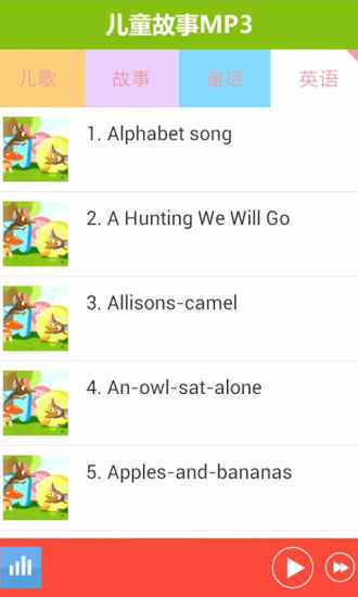 儿童故事MP3 app是一款为儿童打造的MP3故事合集,里面汇集了中外著名故事,童话故事、儿歌和英语等,通过MP3的方式来让孩子记忆更深刻,同时在听的过程中学习和吸收,喜爱的朋友赶快到绿色资源网下载吧!
