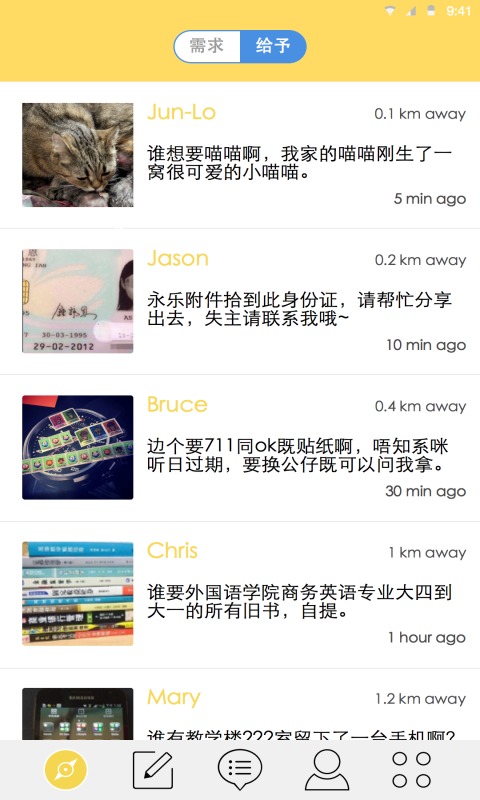 1.我们可以把需求发布给周围的人,同时可查看别人的请求。