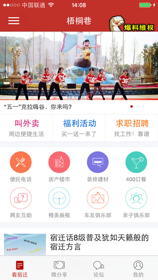 1.梧桐巷论坛主打宿迁地区便民资讯,宿迁的衣食住行,房屋出租,征婚交友等服务。