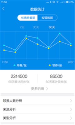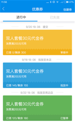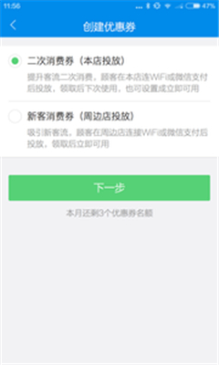 1、商户可以在app上快捷创建电子优惠券,通过针对新顾客的“新客优惠券”和老顾客的“二次消费券”,彻底消灭纸质优惠券,节约成本的同时,达成引新客和留老客的营销目的;