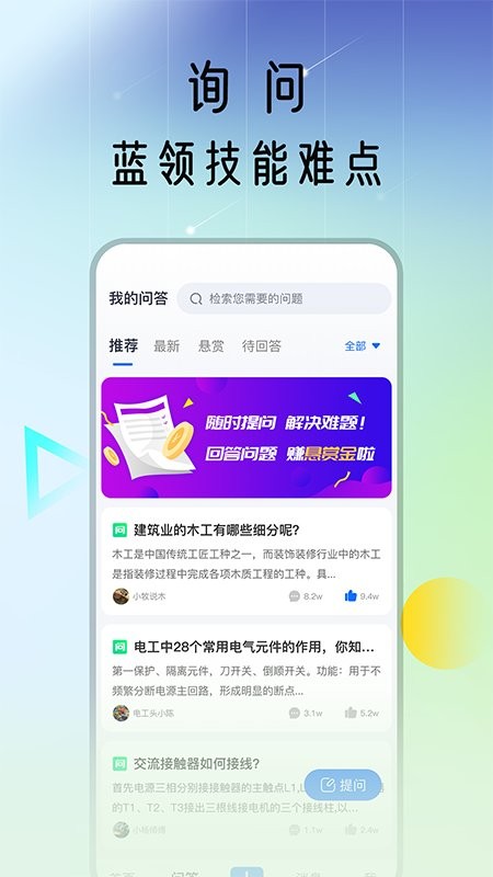 蓝领荟app是为用户提供学习的平台,为用户提供蓝领工作技能的学习,能够进行视频学习,还能线上询问蓝领技能的难点,有哪些不懂的,可以直接线上进行提问,功能种类非常的全面,需要的伙伴们快来使用吧。