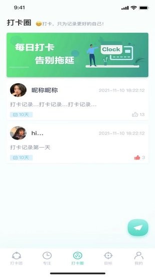 分享自己的打卡时间或是一些相应的打卡目标在打卡圈内,让其他人可以监督自己的打卡学习;