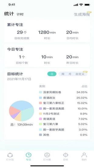 专注时长实时可看见,通过这款软件是可以实时的看见相应的一些自己的坚持时间的;