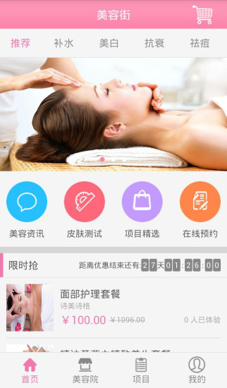 包含限时抢购美容项目、在线预约、项目精选、搜索美容院、皮肤测试、美容资讯、消费订单查询等,致力于为爱美人士提供高性价比的超值美容服务,让更多人实现自己的变美梦想。