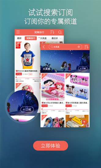 3.搜索订阅:搜索订阅你喜欢的板块,喜欢的精彩再不错过! 如最近想买“学步鞋”,搜索并订阅后,即可每天看到全网最好的学步鞋。