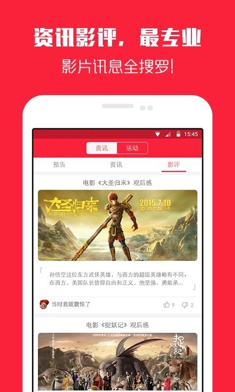 3.通过广泛的大数据分析,获取最公正的电影评分和精彩影评,通过查看千万影迷的真实观影记录,为你的观影做决策,让你选片不用愁。