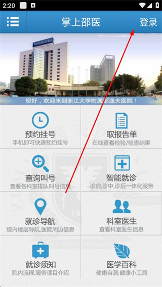 1、在掌上邵医app的首页,点击右上角登录选项。