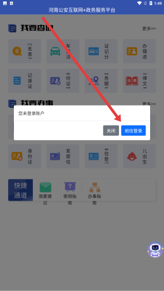 1、河南公安互联网+政务服务平台操作时,弹出未登录提示,点击前往登录进入用户登录页面。