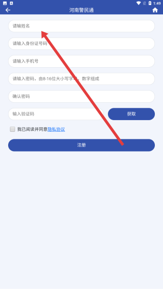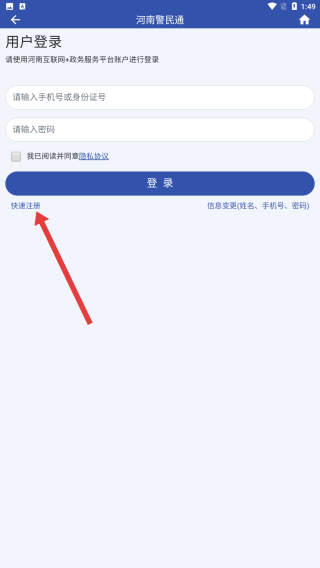 2、在用户登录页面,可以通过点击快速注册选项,跳转至河南警民通的注册信息填写界面。