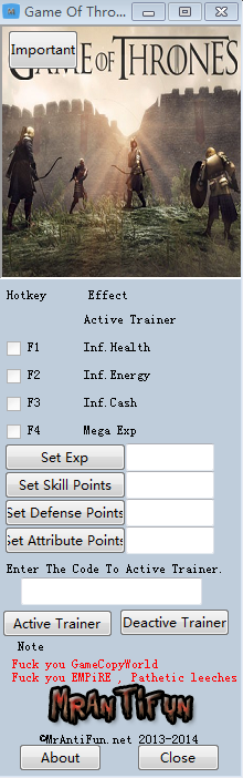 权力的游戏十项修改器是一款功能实用的游戏数据修改工具,你可以将游戏中所有你想要的数据修改成最合适的,一键拥有无限金钱、无限能量、无限生命,轻松完成游戏任务,和游戏中的任务一起冒险吧!