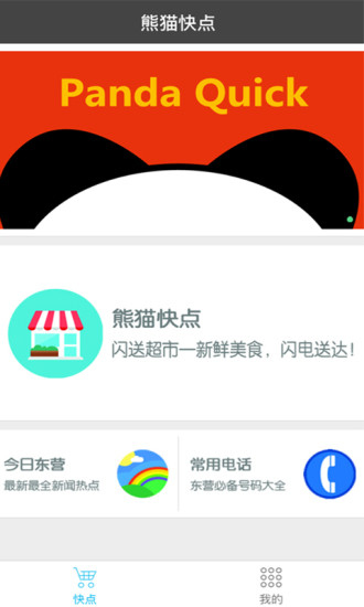 熊猫快点,城市生活服务平台。新鲜美食,闪电送达!熊猫快点是以众包微物流配送为核心模式,基于移动终端技术解决方案提供O2O运营服务,让您足不出户即可尽享送货上门等便民服务。