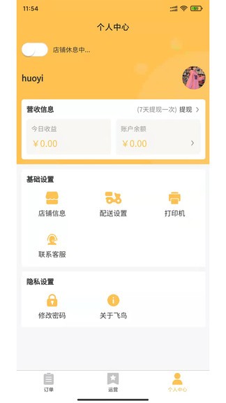 飞鸟闪达商家版软件是供外卖商家用户使用的外卖订单管理app,商户可以在手机上查看实时的订单情况,可以对商品以及配送进行设置,支持进行订单打印,可以设置店铺的营业以及休息时间,欢迎感兴趣的朋友下载使用!