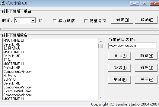 2.找一台机子把你刚充的账号上的余额用得快不足时(注意留一点用来打开和设置机时小偷)打开机时小偷,在‘窗口名称’列表框内找到网管软件的主要进程窗口的名字,点击“终结”就可以了。