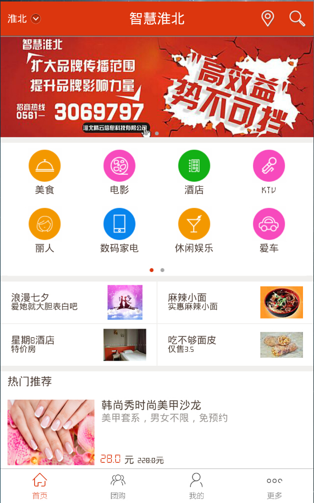智慧淮北,基于O2O+SOLOMO模式,集商城、团购、商圈、优惠券、分享、活动、社区于一体的综合性城市门户。为商家提供传统商业模式的移动电子商务解决方案,将线下消费移植到线上,最终打破开门迎客传统营销模式,利用网络平台变为主动营销。公司与微信合作,在线支付使团购方便快捷,打造移动淮北城市门户。