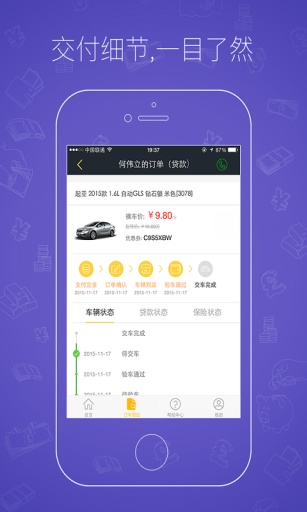 - 动态订单跟踪,实时查看您的买车订单状态。