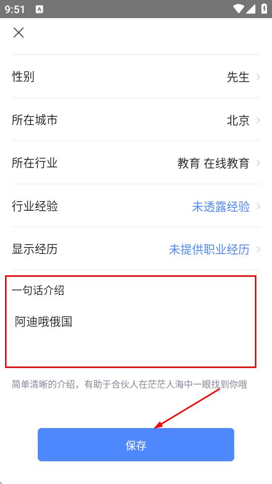 5、进行一句话介绍,完成信息修改后,点击保存按钮,保存所编辑的个人信息。